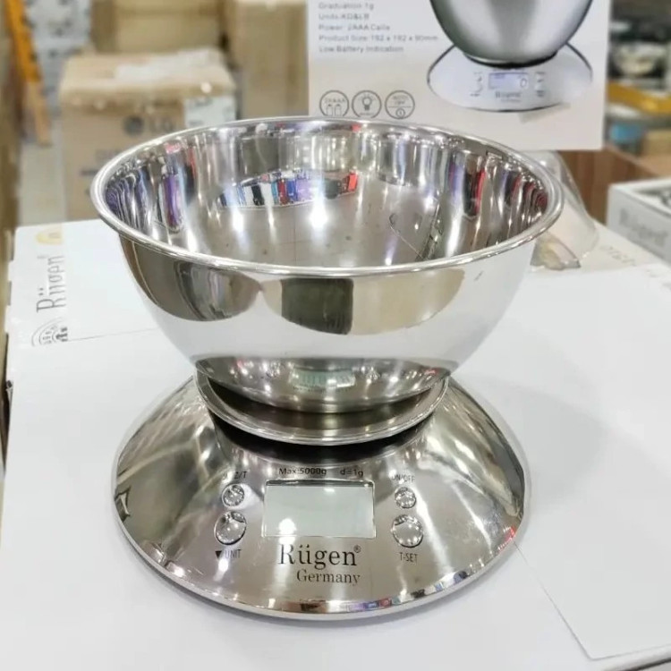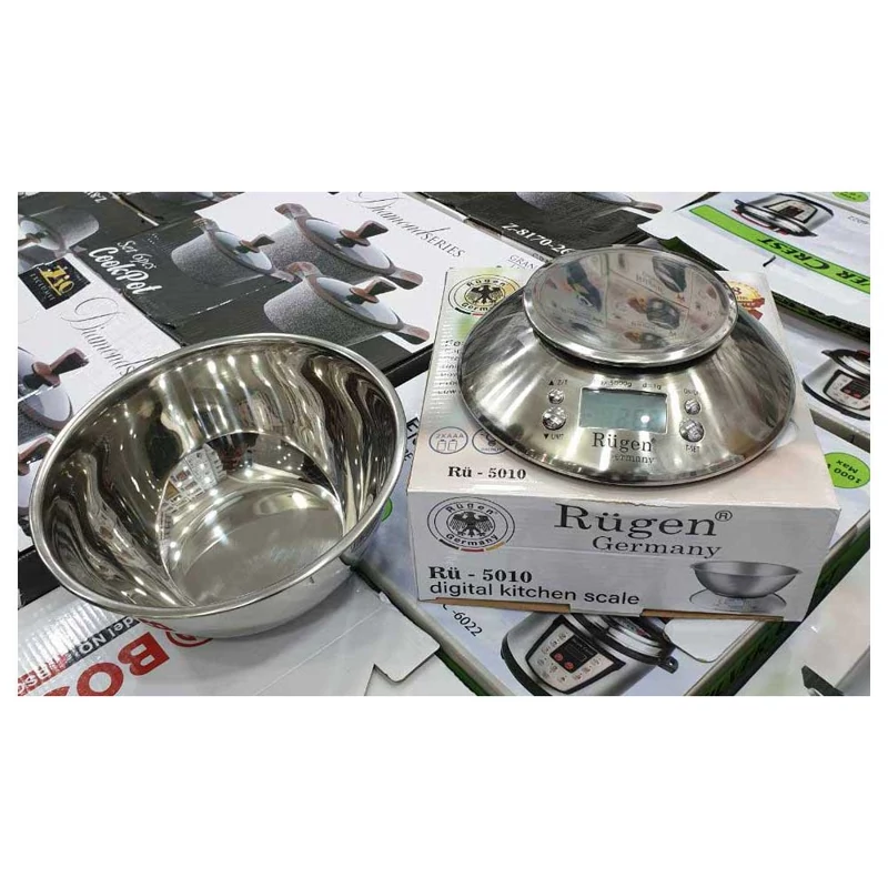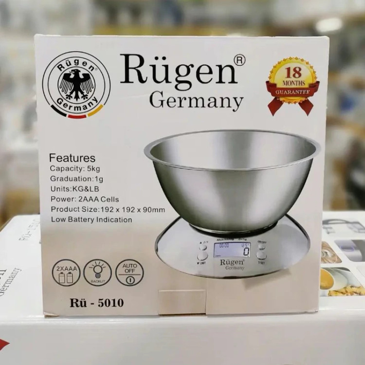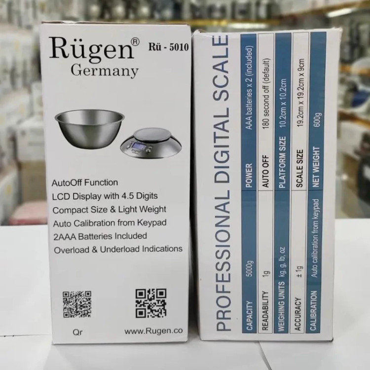 ترازوی دیجیتال آشپزخانه روگن آلمان.جنس کاسه استیل ضخیم. حداقل کشش 1گرم و حداکثر کشش 5کیلوگرم میباشد. دارای نشانگر دمای محیط ،ساعت ،و قابلیت اندازه گیری وزن به سه مدل به همراه گارانتی تعویض و باطری قلمی