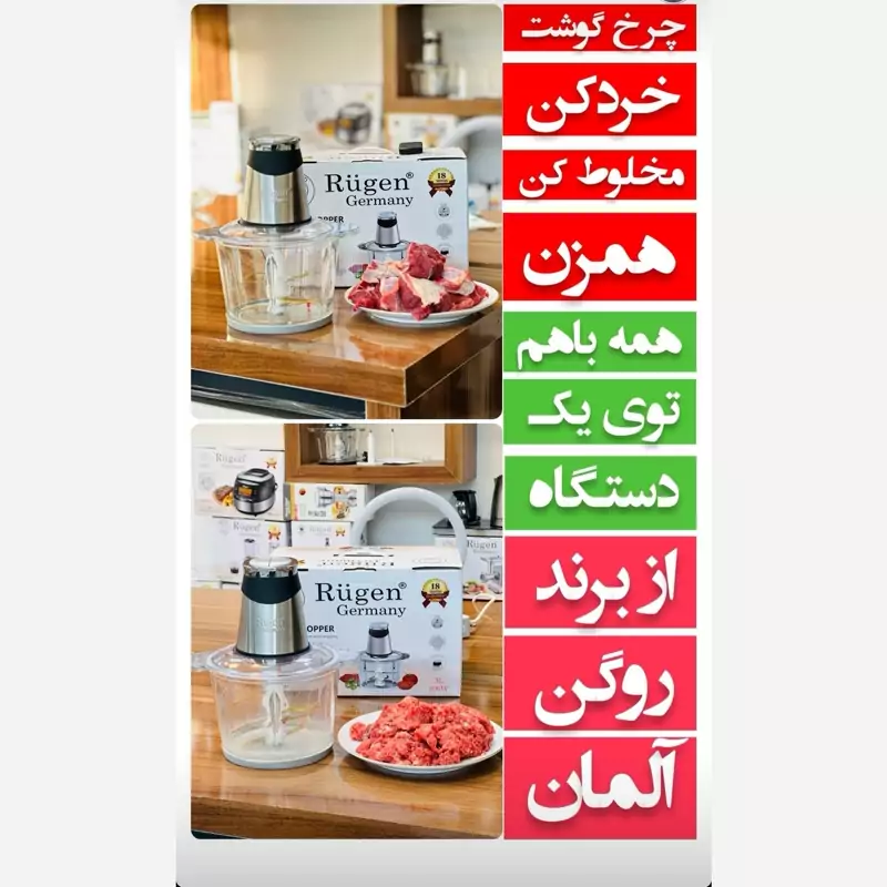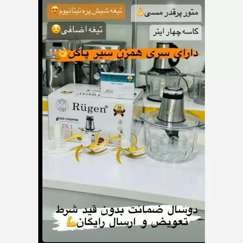 دارای 2 عدد تیغه تیتانیومی دارای یک پره برای همزدن موتور 1000 وات کامل مسی دارای فیوز حرارتی موتور کاسه شیشه ای 4 لیتری دارای 2 سرعت کم و زیاد تیغه های جدا شونده 6 پره